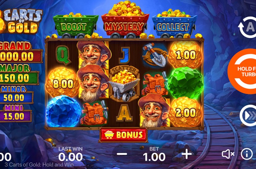 Ga op een spannend avontuur met Playson’s nieuwe slotgame 3 Carts of Gold: Hold and Win, waar een vrolijke goudzoeker en zijn drie met schatten beladen karren klaarstaan om hun overvloedige rijkdommen te delen.