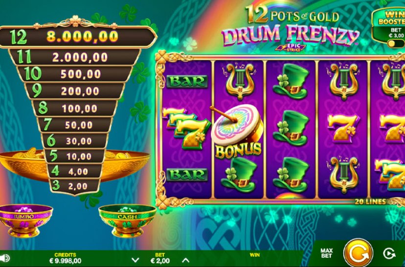 Voel het ritme in 12 Pots of Gold: Drum Frenzy, waar Epic Strike™ en Drum Frenzy™ zorgen voor snelle actie en winsten tot 5.165x.