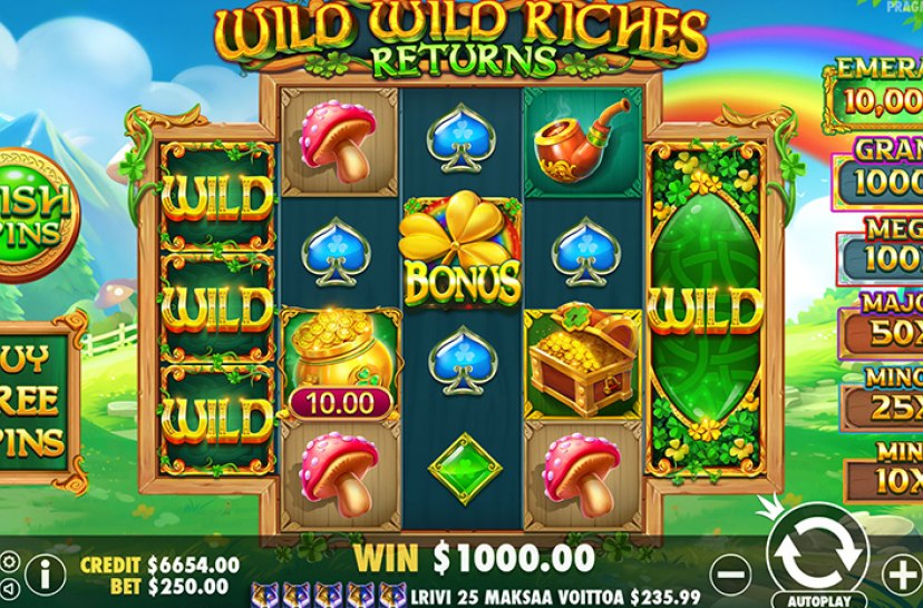 Keer terug naar het Ierse platteland in Wild Wild Riches Returns van Pragmatic Play. Geldsymbolen tot 10.000× betalen wanneer ze samen met Wilds verschijnen. Een sfeervol slot vol Iers geluk en schitterende multipliers.
